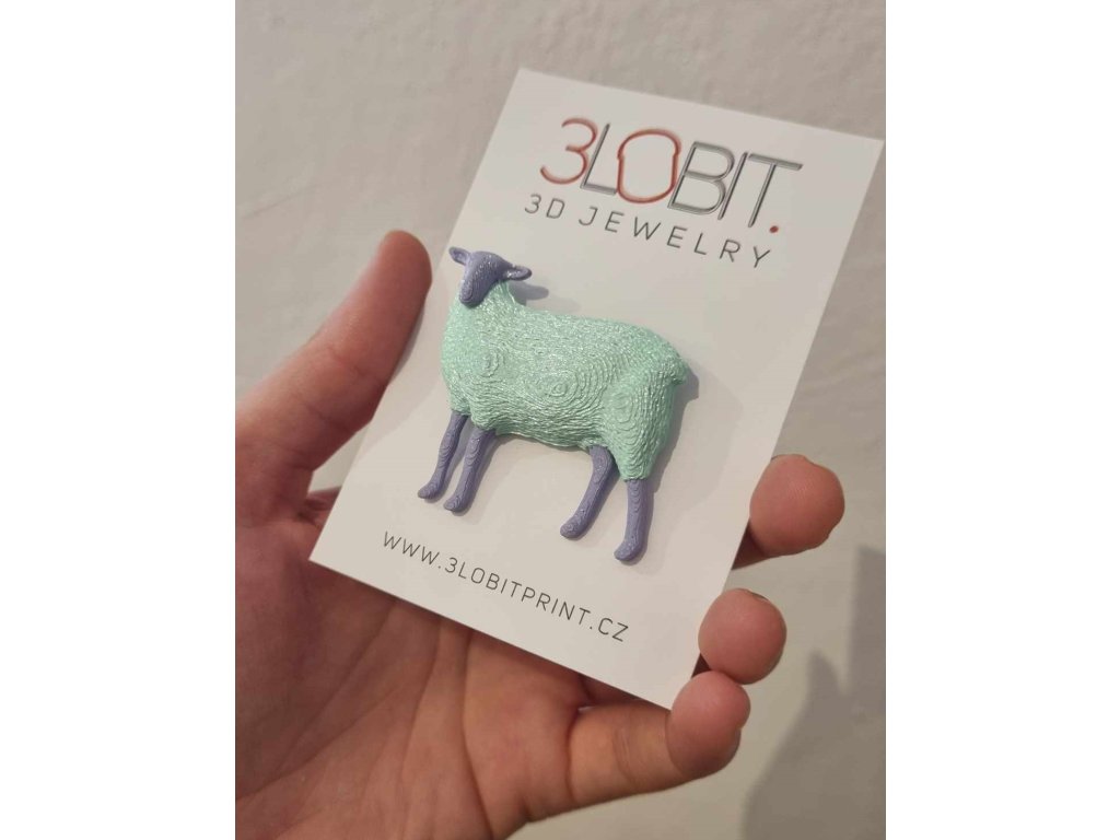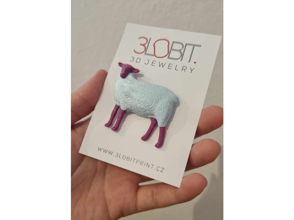 Originální brož Ovečka z 3D tiskárny. Materiál plast PLA.