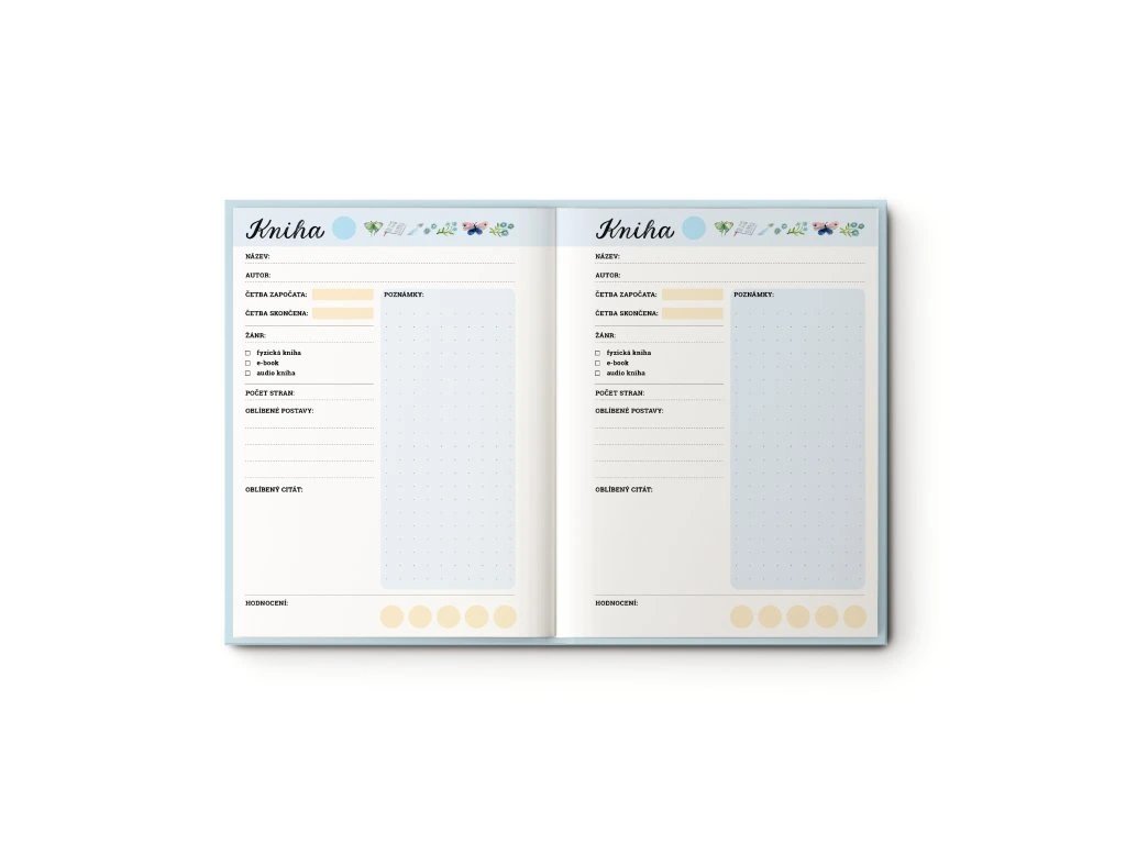 S pevným knižním obalem, formátem 176 x 250 mm a 116 stránkami nabízí prostor pro až 90 zápisů. Každý zápis obsahuje kolonky pro název knihy, autora, datum přečtení, hodnocení a spoustu místa pro vaše osobní myšlenky, oblíbené citáty a poznámky.