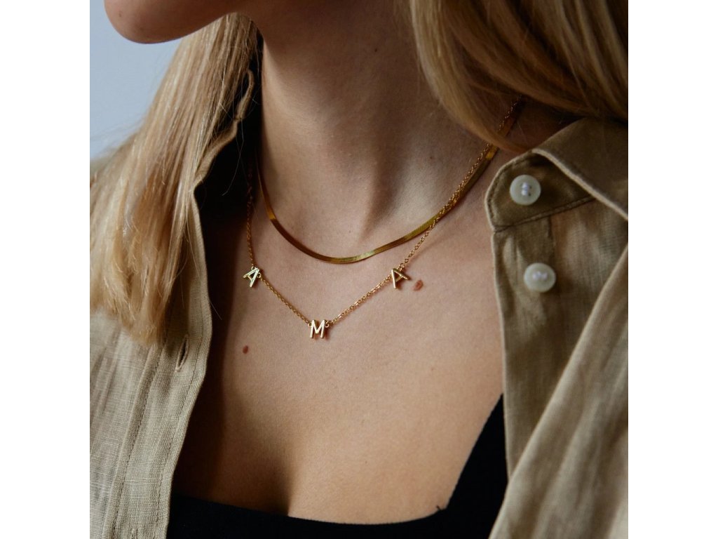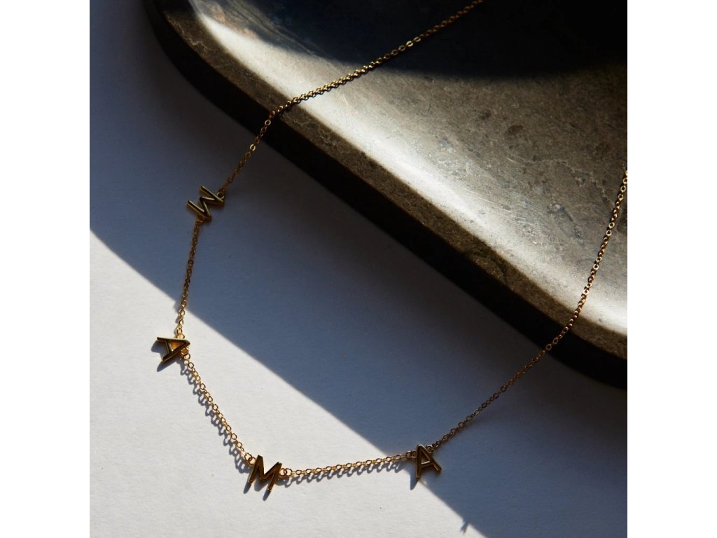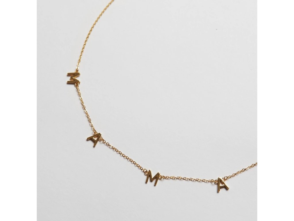 Tolik jemnosti v jednom šperku se zavěšenými písmenky MAMA. Doplňte jej o jemné pozlacené náušnice a rozzařte tak každodenní outfit.