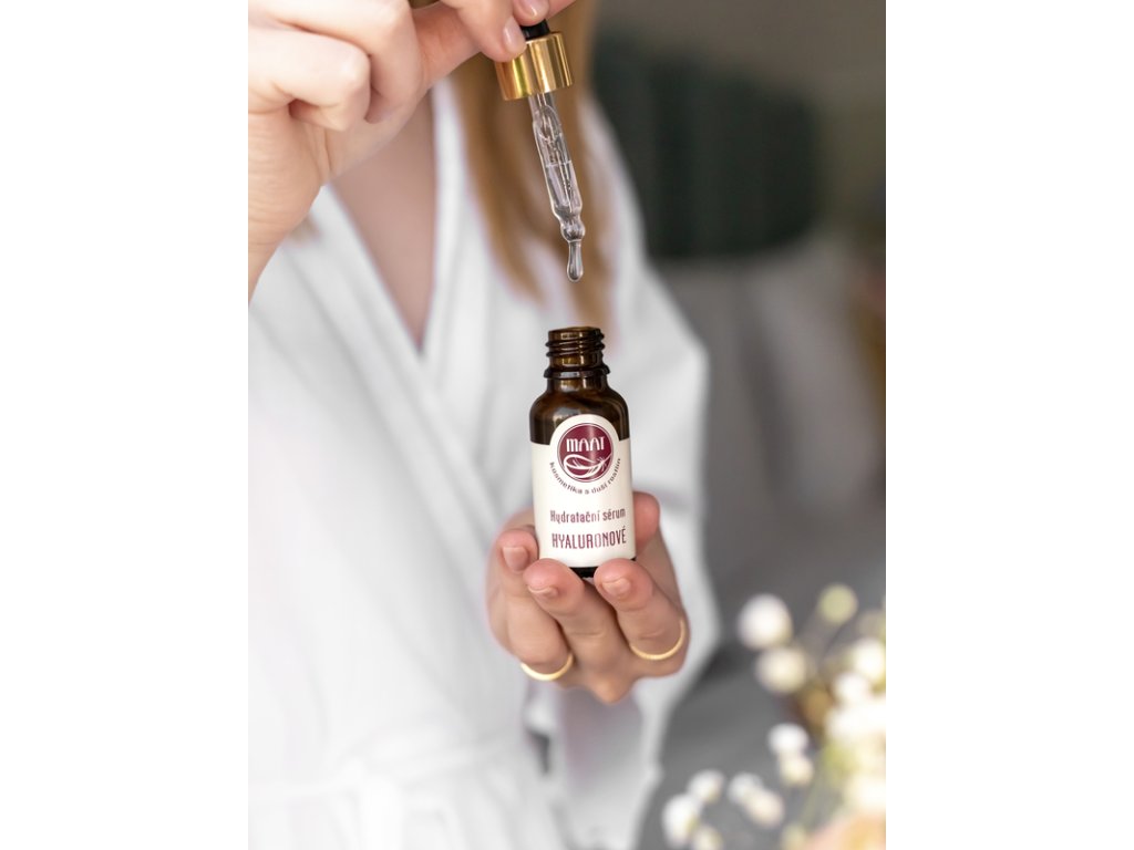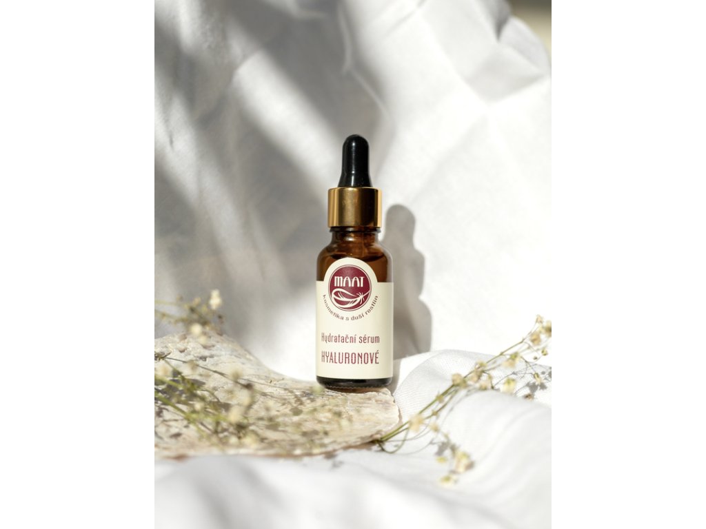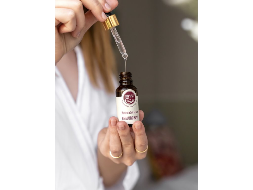 Kyselina hyaluronová - zajišťuje hydrataci kůže, udržuje ji pevnou a pružnou. Pomáhá pokožce zadržovat vodu v pleti a skvěle ji chrání před vnejšími vlivy. Má regenerační účinky a podporuje zdravý a mladistvý vzhled pokožky. Sérum obsahuje kyselinu hyaluronovou v 1,5 % koncentraci.