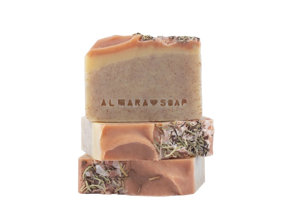 Mýdlo dále obsahuje čisticí růžový a zelený jíl a je zdobené himálajskou solí a sušeným rozmarýnem.
