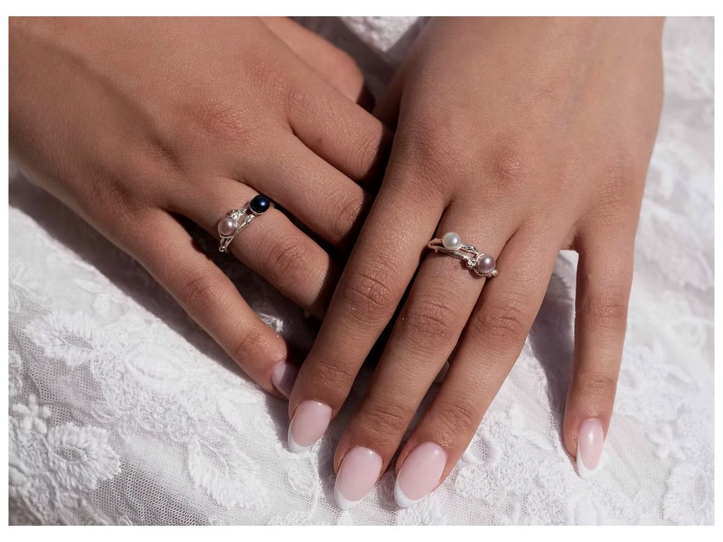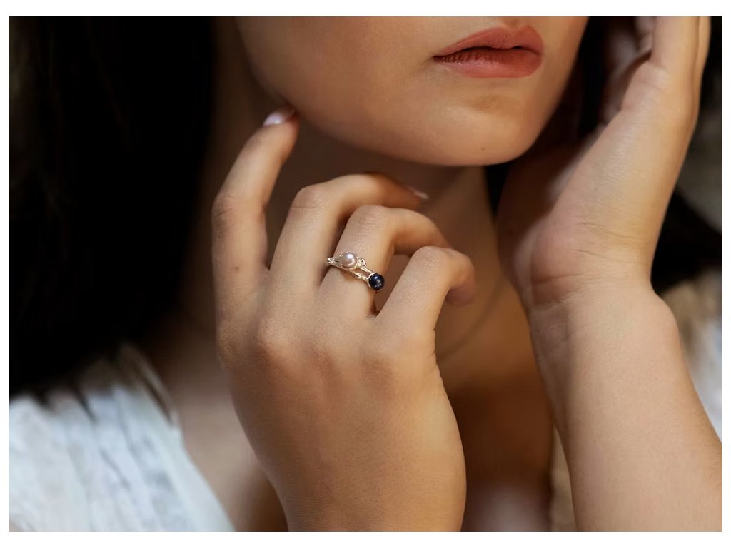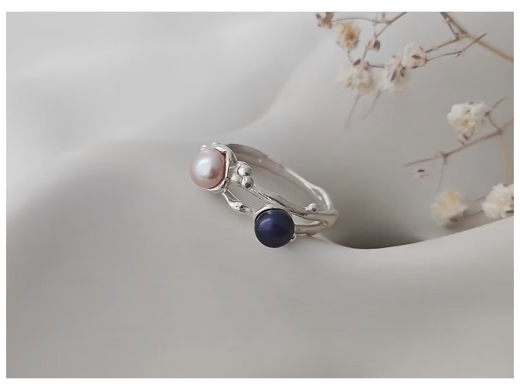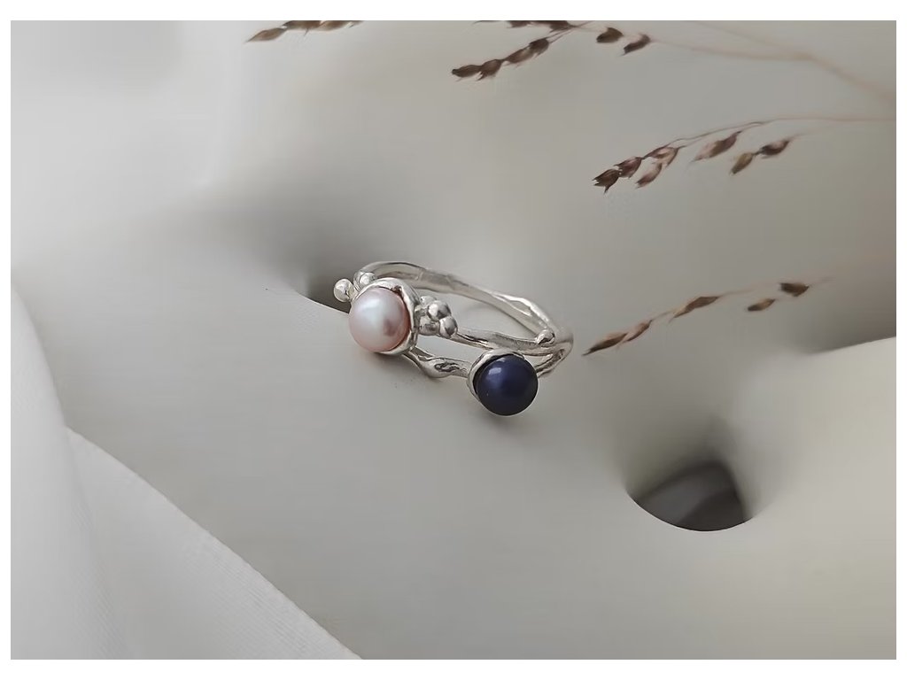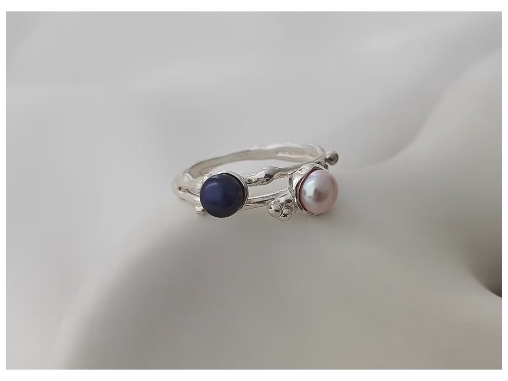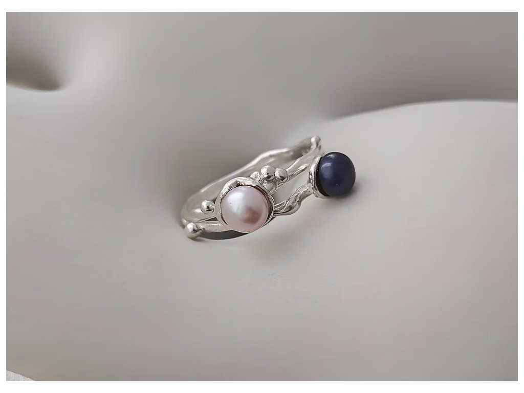 Stříbrný prsten s organickými liniemi propojuje jemnou růžovou a tajemně modro-černou perlu, čímž vytváří jedinečný kontrast plný elegance.
