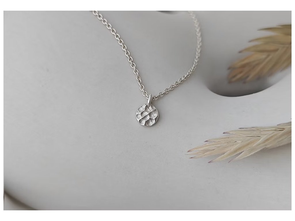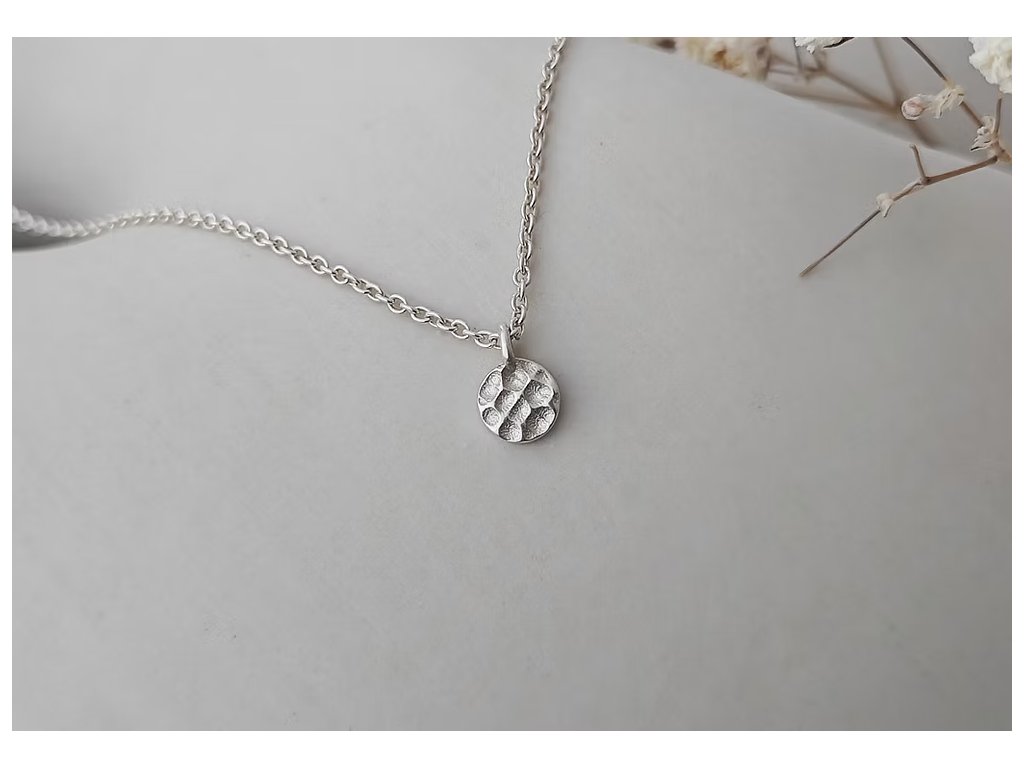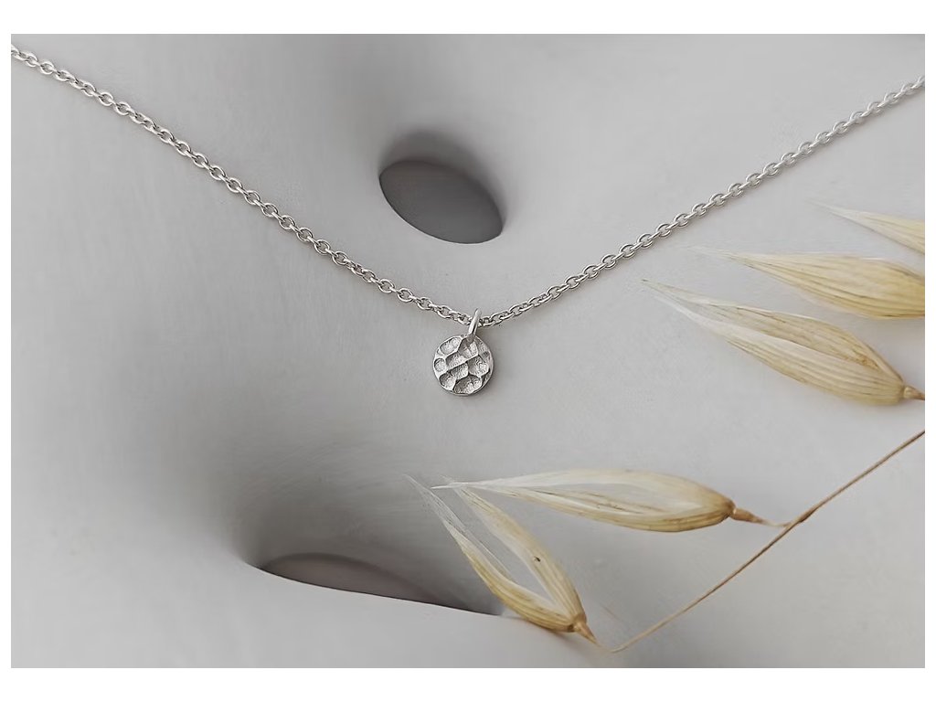 Strukturovaný povrch přívěsku připomíná měsíční reliéf, jehož jemné nerovnosti zachytávají světlo a dodávají šperku hloubku.