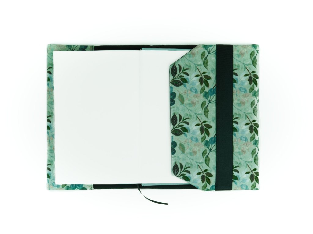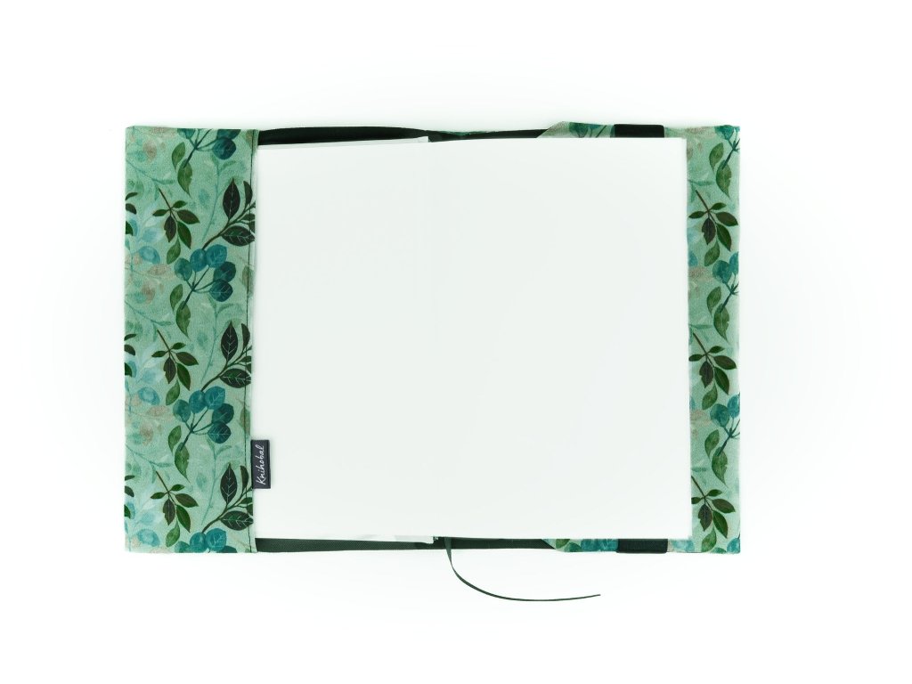 Knihobal má v levé části pevnou širokou kapsu, do které se zasune přední obálka vaší knihy. Vpravo se obal přehne kolem zadní obálky knihy a zafixuje se pomocí gumy tak, aby držela na místě, to znamená, že můžete změnit délku obalu v závislosti na tloušťce vaší knihy.