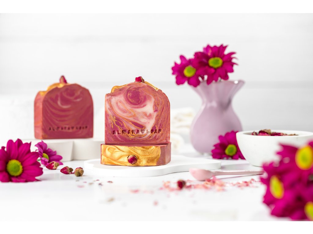 Mýdlo s nádhernou vůní růžového džemu v růžovo-zlaté barvě zdobené růžovým poupátkem. Vytvořené od nás pro vás jako dárek vašim maminkám.