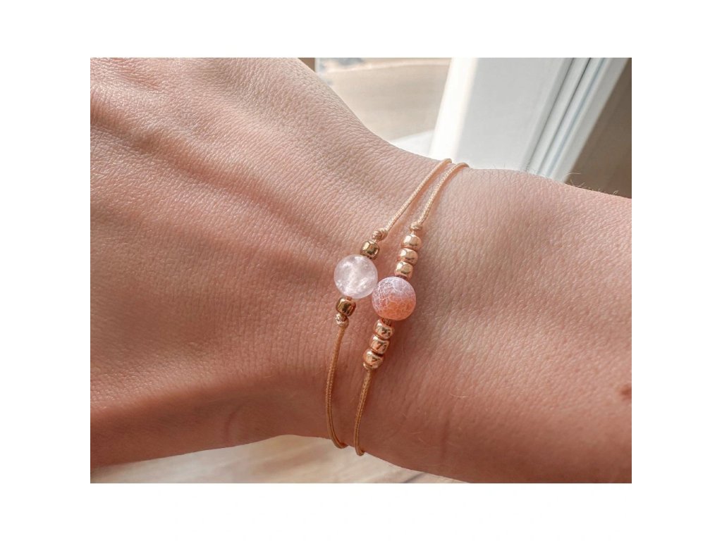 Náramek je navlečen na béžovo-zlaté šňůrce a má posuvné zapínání ve stylu macramé.
