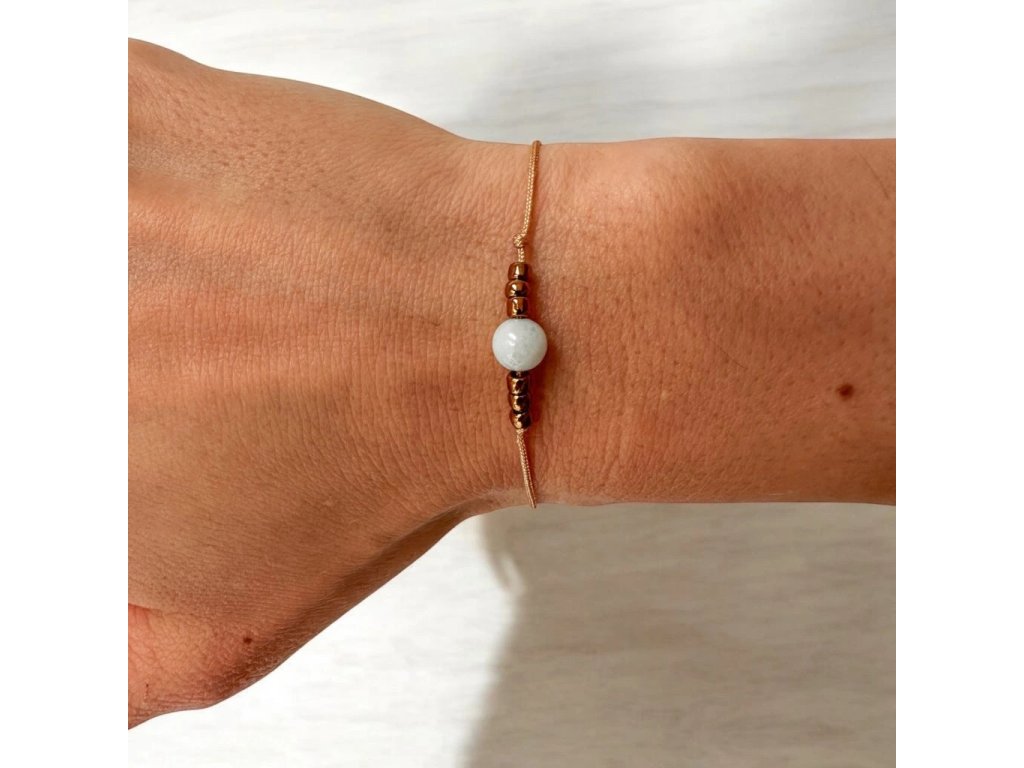 Náramek je navlečen na béžovo-zlaté šňůrce a má posuvné zapínání ve stylu macramé.