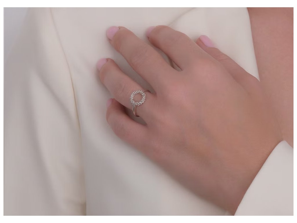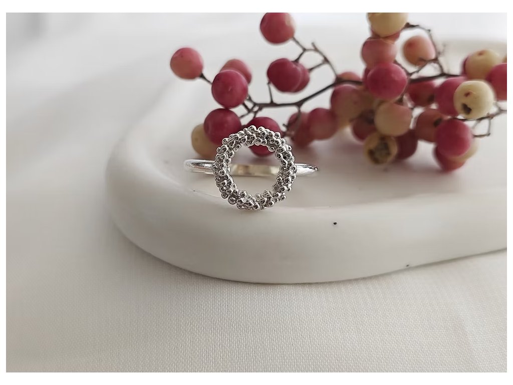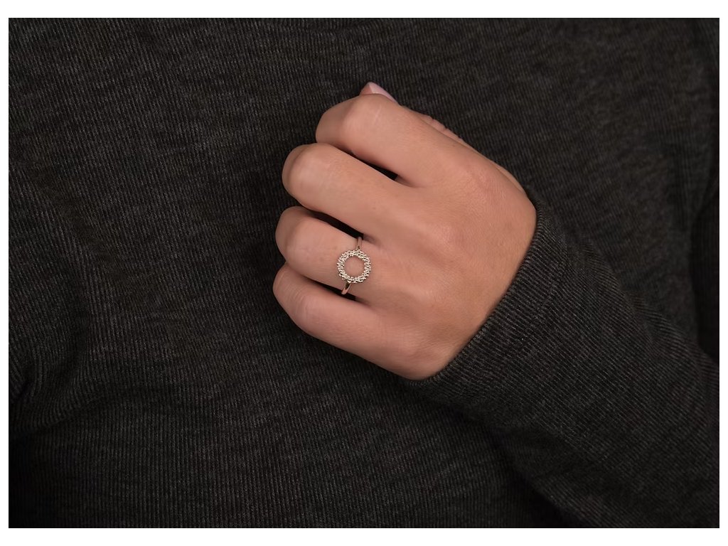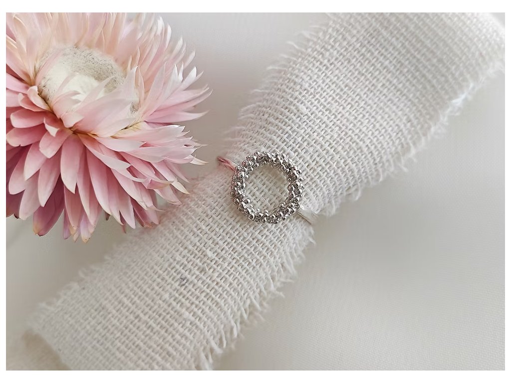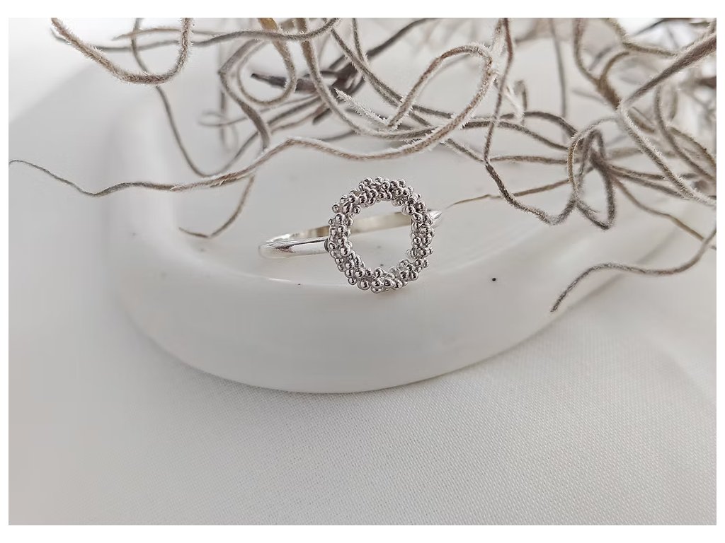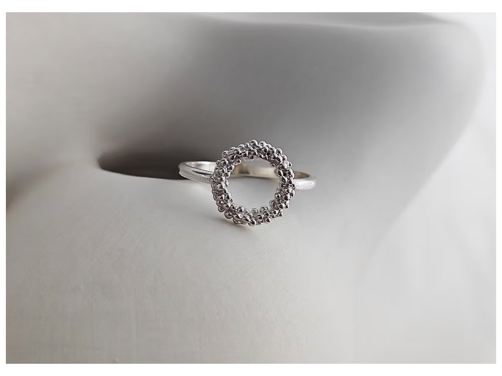 Tento stříbrný prsten s netradiční obrubou z drobných kuliček v sobě spojuje hravost a eleganci.