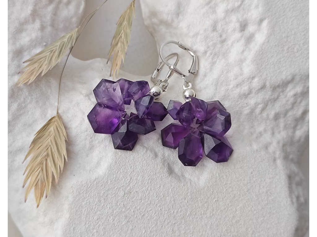 Stříbrné náušnice s přírodními broušenými ametysty, které mají netradiční brus, jenž jim dodává fascinující, geometrickou hloubku.