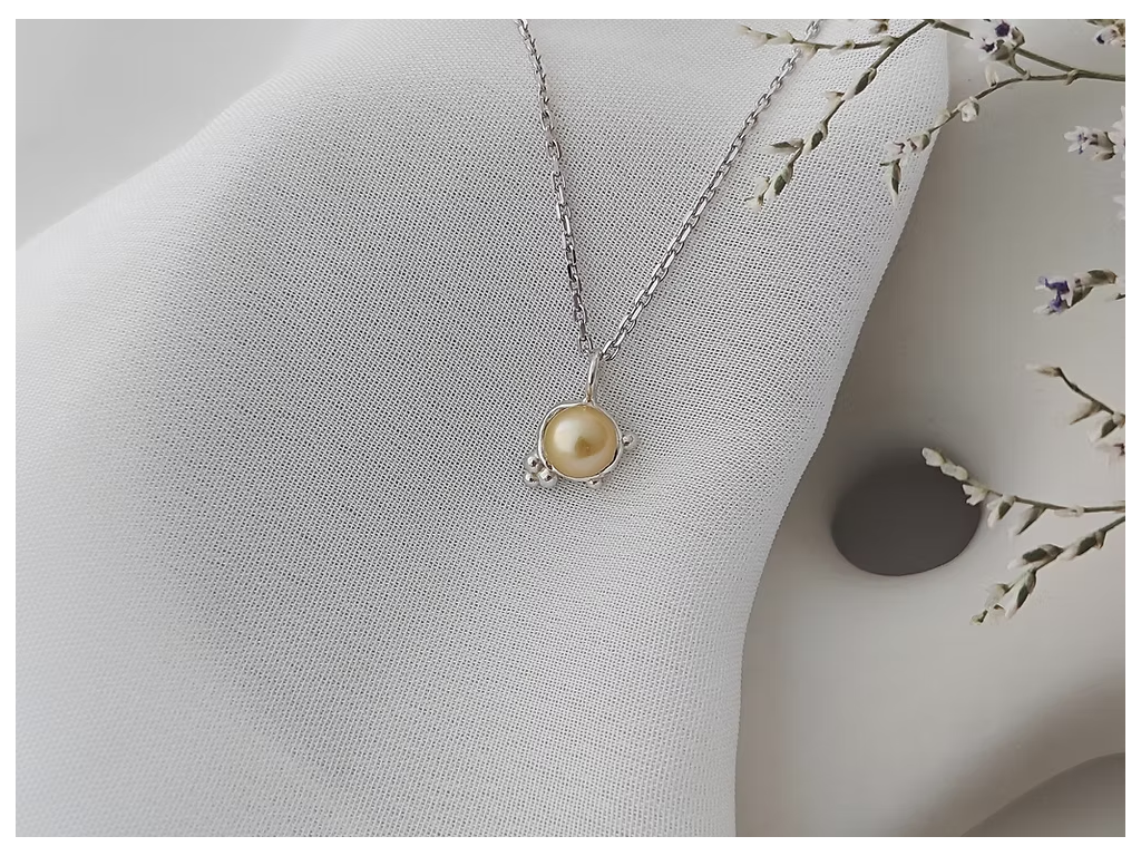 Jeho tvar jemně obepíná perlu, jako by ji chránil – a přesto ji nechává vyniknout.