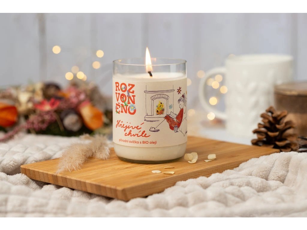 Svíčka Hřejivé chvíle je vyrobena z kombinace přírodních vosků - kokosového a sójového - a je ovoněná 100% přírodními BIO éterickými oleji - zázvorem, citronem a cedrem.