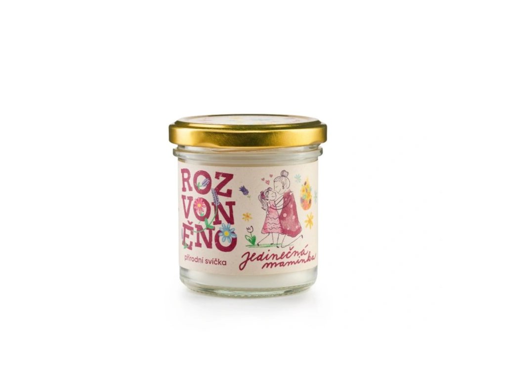 Svíčka Jedinečná maminka je vyrobena z kombinace přírodních vosků - kokosového a sójového - a je ovoněná 100% přírodními éterickými oleji - geránií, pomerančem a pačuli. Vůně do svíčky byly vybírány tak, aby byly vhodné jak pro těhotné tak kojící ženy a jejich miminka.