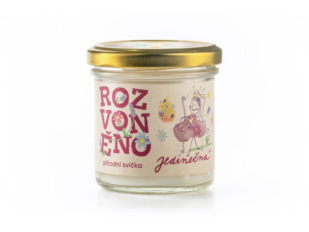 Svíčka Jedinečná je vyrobena z kombinace přírodních vosků - kokosového a sójového - a je ovoněná 100% přírodními éterickými oleji - geránií a palmovou růží.
